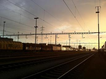 Keywords: railway switzerland muttenz gleise railway station evening goods wagons freight train reddish warm abendstimmung sunset twilight train