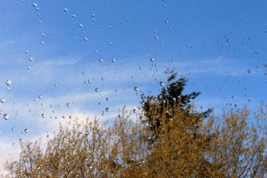 Keywords: rain raindrop window pane nature drip wet beaded trees sky weather