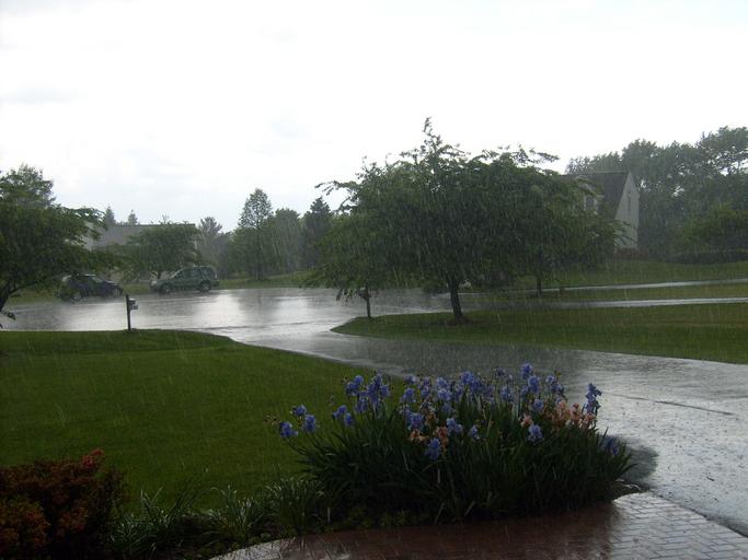 Keywords: rain shower water wet car street flowers