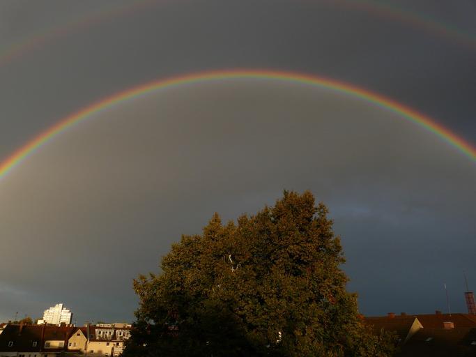 Keywords: rainbow double rainbow mirroring refraction double two dark phenomenon rain sunshine sky nature spectrum colorful natural phenomenon rainbow colors ray natural spectacle of course spectacular clouds half circle tree secondary rainbow