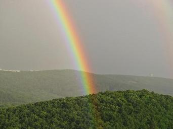 Keywords: rainbow sky wood forest hills landscape outdoor colorful color