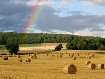 Keywords: rainbow weather mood sky natural spectacle natural phenomenon rainbow colors clouds refraction weather phenomenon straw rolls straw stubble field straw bales
