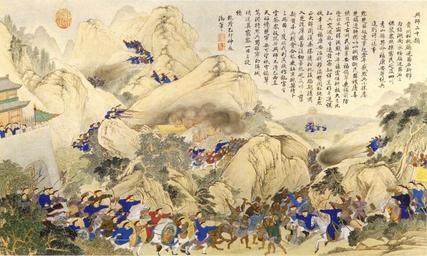 | Keywords: Raising an army.jpg en A scene of the Qing dynasty campaign against the Miao Hunan 1795 zh-hans 清æ 平苗军队兴师图 http //www battle-of-qurman com cn/e/hist htm late XVIII century A collaboration between Chinese and European painters The Jesuit missionaries involved in producing the drawings in China were Giuseppe Castiglione Jean-Denis Attiret Ignace Sichelbart and Jean Damascene The engravings were executed in Paris under the direction of Charles-Nicolas Cochin of the Académie Royal at the Court of Louis XVI and the individual engravers include Le Bas Aliamet Prevot Saint-Aubin Masquelier Choffard and Launay PD-Art Military of Qing China Ten Great Campaigns Paintings of the Qing Dynasty Cavalry of China |