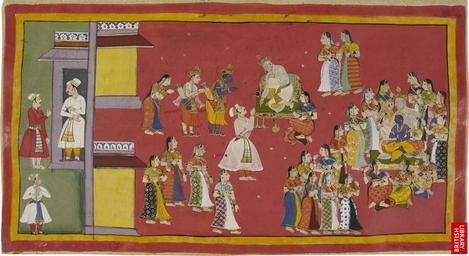 | Keywords: Ramayana - Pages 9 and 10.jpg en At the palace the king's minister Sumantra brings Rama Laksmana and Sita to the grieving Dasaratha who had previously ordered Sumantra to summon his queens and all his women The king tries to persuade Rama not to go to the forest even to rise up in rebellion and set him aside but Rama replies that he must obey Kaikeyi's command to go into exile Kaikeyi who is seated beside Dasaratha is upbraided by Sumantra but she refuses to change her mind Unable to speak through grief Dasaratha tenderly embraces the three children taking them on his lap surrounded by his three chief queens and his other wives date http //www bl uk/onlinegallery/ttp/ramayana/accessible/pages9and10 html author PD-Art Uploaded with UploadWizard Kaikeyi Art of India in the British Library Paintings of Ramayana Rama Lakshmana Dasaratha 17th-century paintings from India Illuminated manuscripts created in India |