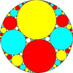 | Keywords: RandomApollonianCircleFractal.svg en Randomized Apollonian circle packing fractal generated by Javascript code Coloured so that no neighbouring circles have the same colour own ClaudiusMaximus 2010-11-15 Cc-zero Apollonian gasket Circle_packings Four-color theorem |