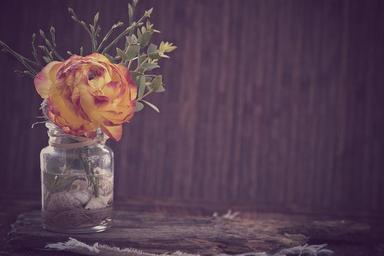 Keywords: ranunculus flower blossom bloom petals orange wood vase deco decoration text freedom close vintage-look