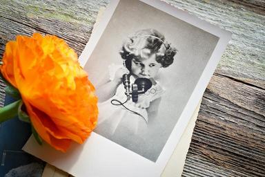 Keywords: ranunculus flower blossom bloom orange postcard girl phone old antique still life close