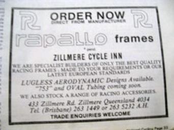 Keywords: Rapallo Bicycle Addvertisement.jpg en Photo of original Rapallo frame builders advertisement 1970's own Beaumontmajor 2010-01-01 Free Bicycles in Australia Bicycle frames