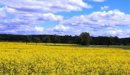 Keywords: rapeseed colza canola field flowers yellow clouds sky trees germany nature countryside