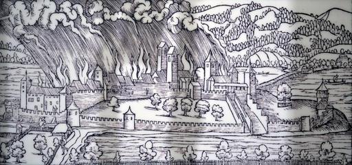 | Keywords: Rapperswil - Brandschatzung 1350 - Chronik Stumpf 1547-48 Faksimile Stadtmuseum.jpg Rapperswil SG Zerstörung von Rapperswil durch Rudolf Brun am 24 Februar 1350 Holzschnitt aus der Stumpf'schen Chronik 1547/48 Nach dem Faksimile im Stadtmuseum Rapperswil Rapperswil SG Destruction of Rapperswil by Rudolf Brun on 24 February 1350 Woodcut from Stumpf'sche Chronik 1547/48 From facsimile in Rapperswil-Jona museum «Von dem Zürychgow» Bild und Beschreibung fol 140 aus Band II der Schweizer Chronik Zürich 1548 <br> fol 140 Beschriftung oberhalb « anno domini 1350 an S Matthis abend Aber sein volck ward abgetriben / und Graaff Hans Johann II von Habsburg-Laufenburg selber gefangen / zů Zürych lange zeyt in gfencknuß enthalten / darvon hernach mer gesagt wirt Darzwüschend ward statt und schlossz Rappers» fol 140 Beschriftung unterhalb «wyl von den Zürychern erobert und besetzt Als aber die anderen Graven von Habspurg die jüngeren Brüder von Johann II Rudolf IV und Gottfried II keinen friden mit Zürych annemmen woltend / und die Zürycher ires zůsatzes » Ergänzungen und Erläuterungen stehen in eckigen Klammern <br>Rapperswil von Norden Der Holzschnitt illustriert die Brandschatzung durch Rudolf Brun im Jahre 1350 Die Silhoutte der Stadt wird bereits in ihrer ersten Nordansicht exakt wiedergegeben Vom Halsturm zieht sich die Häuserfront nach Westen bis zu Kirche in der Bildmitte mit den zwei markanten Kirchtürmen und Schloss Der Wachturm am Westende Endingerhorn ab 1606 Standort des Kapuzinerklosters des Burghügels und der vom Zürichsee umgebenden Halbinsel ist in die zinnenbekrönte Ringmauer der Stadtbefestigung eingefügt <br>Faksimile der Schweizer Chronik von Johannes Stumpf Zürich 1548 Chr Froschauer Bd II fol 140 Beschreibung gemäss ergänzter Beschriftung des Exponats im Stadtmuseum Rapperswil <br>Anzumerken ist dass die Stadtansicht gemäss Johannes Stumpf jene aus dem Jahr 1350 darstellen soll die am Bildrand rechts erkennbare Holzbrücke Rapperswil-Hurden wurde im Auftrag von Herzog Rudolf IV Rudolf der Geistreiche von Habsburg-Österreich aber erst in den Jahren 1358 bis 1360 erbaut Obwohl bereits prähistorische Vorgängerbauten der Holzbrücke aus dem zweiten Jahrtausend v Chr bis ins 2 Jahrhundert n Chr archäologisch bestens dokumentiert sind erwähnen die historischen Quellen aus spätmittelalterlicher Zeit Herzog Rudolf IV als Baumeister/Initiant des ersten Brückenbaus von 1358/60 1547/48 fotografiert am 22 April 2008 im Stadtmuseum Rapperswil Johannes Stumpf upload by Roland zh on 26 April 2008 Zustimmung für Verwendung der fotografierten Ausstellungsobjekte in der Wikipedia vor Ort eingeholt <gallery perrow 4> File Rapperswil - Zerstörung 1350 - Chronik Stumpf 1547-48 jpg File Rapperswil - Alter Zürichkrieg 1445 - Der gefangene 'Bär' nach Stumpf's Chronik jpg </gallery> PD-old GFDL cc-by-sa-3 0 2 5 2 0 1 0 Third party works photographed by User Roland zh Town walls of Rapperswil History of Rapperswil Historical images of Holzbrücke Rapperswil “Hurden Collections of Stadtmuseum Rapperswil 1350 in Switzerland Johannes Stumpf Historical images of Rapperswil-Jona April 2008 in Switzerland 2008 in Rapperswil-Jona Historical images of Schloss Rapperswil Wooden bridges in art Fires in Switzerland |