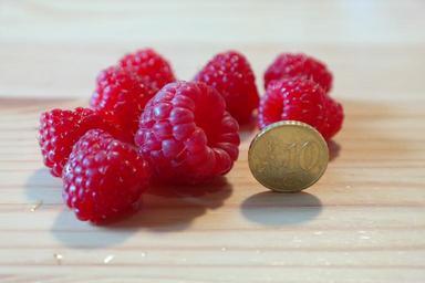 Keywords: raspberries large huge size comparison coin 10 cents dime piece money fruits fruit berries vitamins sweet healthy red