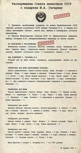 | Keywords: Rasporjazhenie Soveta Ministrov SSSR o podarkah Ju.A.Gagarinu ot 18.04.1961 № 1037-рс.jpg ru Распо яжение Совета инист ов СССР о пода ках Ю А Гага ину 1037- с <br /> en Regulation of the Council of Ministers of the USSR Yuri Gagarin on gifts 1037- с 18 ап еля 1961 / 18 april 1961 Совет минист ов СССР / Council of Ministers Soviet Union Совет минист ов СССР / Council of Ministers Soviet Union PD-RU-exempt April 1961 in the Soviet Union 18 April Council of Ministers of Soviet Union Yuri Gagarin |