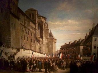 | Keywords: Rattachement Savoie-France - Chambéry (1860).jpg en Picture of a painting showing the people of the city of Chambéry waving French flags at the city's castle while the Duchy of Savoie is made part of France in 1860 fr Photo du tableau montrant les Chambériens brandissant des drapeaux français au pied du château des ducs lors du rattachement de la Savoie à la France en 1860 b 1890 Oil on canvas Size cm 147 212 Institution Musée des Beaux-Arts de Chambéry credit line Musée des beaux-arts d'Angoûlème Musée des beaux-arts de Chambéry accession number D 58-1-1 Château des ducs de Savoie de Chambéry fac-simile ” http //www culture gouv fr/public/mistral/joconde_fr ACTION CHERCHER FIELD_98 REF VALUE_98 10480004238 Notice Base Joconde PD-old-70-1923 Atelier graphique Historical images of Chambéry Paintings in Savoie |