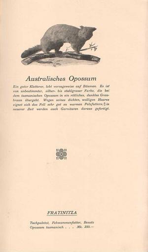 | Keywords: Rauchware (Pelze und Preise) 1910 (03).jpg Rauchware Pelze und Preise 1910 Ohne Autorenangabe Vermutlich Katalog anlässlich einer Pelzmodenschau Jede Seite eingeleitet mit der Beschreibung eines Pelztiers dann Modellnamen und Preise unknown / Collection Kuhn 1910 Kürschner PD-old Rauchware Pelze und Preise 1910 Possum clothing Squirrel clothing Trichosurus |