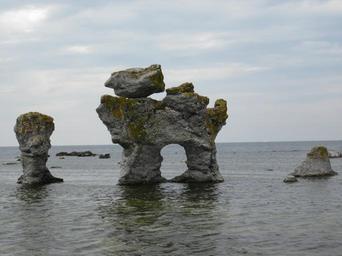 | Keywords: Rauk at Fårö.jpg en The rauk Hunden The Dog also called Kaffepannan The coffee kettle at Gamle hamn om the Swedish island of Fårö's west coast sv Rauken Hunden som även kallas för Kaffepannan vid Gamle hamns raukområde på Fårös västkust own Mr Bullitt 2010-08-07 Gamle Hamn Natural arches in Sweden Balanced rocks |