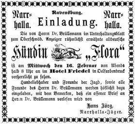 | Keywords: Ravensburg Fastnacht 1881 Narrhalla Hündin Flora.jpg Ravensburg Oberschwäbischer Anzeige 1881 Anzeige der Gesellschaft žNarrhalla zu einer Fastnachtssitzung zum Thema žHündin Flora Hotel Friedel 16 Februar 1881 Beate Falk Chronik der Ravensburger Fasnacht 1353 “1968 in Albert Schmid Hrsg Fasnacht in Ravensburg Ein Streifzug von 1353 bis heute Oberschwäbische Verlags-Anstalt Ravensburg 2000 ISBN 3-926891-25-4 S 49 1881 author PD-old-100 History of carnival in Ravensburg 1881 in Germany |
