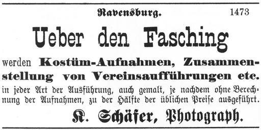 | Keywords: Ravensburg Fastnacht 1887 Photograph Schäfer 2.jpg Ravensburg Anzeige im Oberschwäbischen Anzeiger 19 Jh Photograph K Schäfer bietet Aufnahmen von Masken und Maskengruppen an Beate Falk Chronik der Ravensburger Fasnacht 1353 “1968 in Albert Schmid Hrsg Fasnacht in Ravensburg Ein Streifzug von 1353 bis heute Oberschwäbische Verlags-Anstalt Ravensburg 2000 ISBN 3-926891-25-4 S 89 wohl 1887 Bildnachweis ist nicht ganz eindeutig interpretierbar 1887 author PD-old-70-1923 History of carnival in Ravensburg History of photography |