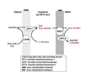 Keywords: Reactions through mitochondrial membrane.png en mechanism of fatty acids and L-carnitine going through mitochondrial membrane own Matsan5 2010-06-07 Carnitine Dietary supplements