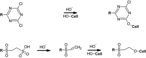 Keywords: Reactive dyes.png en Reactive dyes + cellulose de Reaktivfarbstoffe + Cellulose own FK1954 2009-02-19 Chemical reactions Dyes