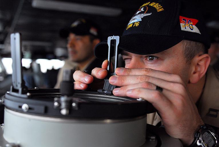| Keywords: Readings from a bearing ring at sea DVIDS89454.jpg en Lt Thomas Louden takes readings from a bearing ring while standing junior officer of the watch during a sea and anchor evolution aboard the Nimitz-class aircraft carrier USS Ronald Reagan Ronald Reagan is in the Pacific Ocean conducting routine carrier operations U S Navy photo/Petty Officer 2nd Class Marc Rockwell-Pate 2008-01-28 Petty Officer 2nd Class Marc Rockwell-Pate https //www dvidshub net/image/89454 080128-N-+++++-083 2008-05-19 15 07 USPACOM AT SEA PD-USGov-Military-Navy USS Ronald Reagan CVN-76 Images from DoD uploaded by Fæ |