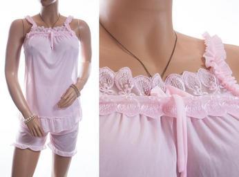 Keywords: Cute Ostalgie 2-piece babydoll pyjama set in silky soft pink nylon..... dreamdate emmaatdreamdate silkynighties