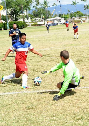 | Keywords: Reagan soccer team shines in RIMPAC tournament 140702-N-ON707-466.jpg en Aviation Boatswain ™s Mate Handler 1st Class David Flores Ramirez dribbles the ball as the USS Ronald Reagan soccer team plays a match against a team from the USS Cape St George in the 2014 Rim of the Pacific Soccer Tournament Ronald Reagan is currently in Hawaii for RIMPAC 2014 Twenty-two nations more than 40 ships and submarines more than 200 aircraft and 25 000 personnel are participating in RIMPAC exercise from June 26 to Aug 1 in and around the Hawaiian Islands The world ™s largest international maritime exercise RIMPAC provides a unique training opportunity that helps participants foster and sustain the cooperative relationships that are critical to ensuring the safety of sea lanes and security on the world ™s oceans RIMPAC 2014 is the 24th exercise in the series that began in 1971 2014-07-02 CVN 76 https //www dvidshub net/image/1450678 140702-N-ON707-466 2014-07-16 20 34 PEARL HARBOR HI US PD-USGov-Military-Navy USS Ronald Reagan CVN-76 RIMPAC 2014 Images from DoD uploaded by Fæ |