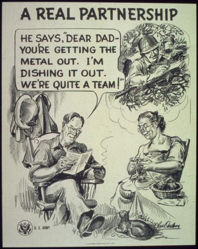Keywords: "A real partnership" - NARA - 513737.jpg Scope and content General notes Parents on home front reading letter from combat soldier son Message is on partnership of metal conservation and scrap drives at home being essential to the war effort 513737 Local identifier 44-PA-290 Office for Emergency Management Office of War Information Domestic Operations Branch Bureau of Special Services 03/09/1943 - 09/15/1945 Still Picture Records Section Special Media Archives Services Division NWCS-S National Archives at College Park 8601 Adelphi Road College Park MD 20740-6001 1942 - 1945 Record group Record Group 44 Records of the Office of Government Reports 1932 - 1947 Record group ARC 373 World War II Posters compiled 1942 - 1945 Series ARC 513498 File unit File unit ARC Variant control numbers NAIL Control Number NWDNS-44-PA-290 Other versions <gallery> File A_real_partnership _-_NARA_-_513737 tif tif File A_real_partnership _-_NARA_-_513737 jpg jpg </gallery> NARA-cooperation PD-USGov World War II posters from the United States Recycling in the United States in World War II World War II home front in the United States Wartime economy propaganda Couples in propaganda Soldiers in World War II propaganda of the United States Metal recycling in the United States |