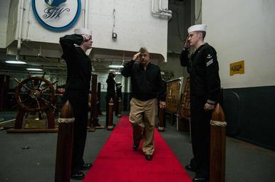 | Keywords: Rear Adm. John King visits USS George Washington 140317-N-IV489-038.jpg en Rear Adm John King commander Navy Weapon Systems Support center renders honors to side boys while embarking the U S Navy's forward-deployed aircraft carrier USS George Washington George Washington and its embarked air wing Carrier Air Wing 5 provide a combat-ready force that protects and defends the collective maritime interest of the U S and its allies and partners in the Indo-Asia-Pacific region 2014-03-17 CVN 73 https //www dvidshub net/image/1188388 140317-N-IV489-038 2014-03-17 09 42 YOKOSUKA JP PD-USGov-Military-Navy USS George Washington CVN-73 Images from DoD uploaded by Fæ |