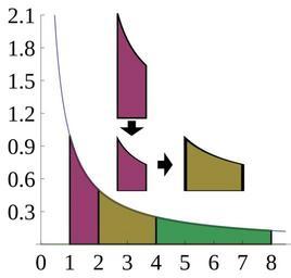 | Keywords: Reciprocal integral.svg en A plot giving some geometric intuition for why the integral of 1/x is ln n based roughly on an explanation from http //arcsecond wordpress com/2011/12/17/why-is-the-integral-of-1x-equal-to-the-natural-logarithm-of-x/ Why is the integral of 1/x equal to the natural logarithm of x The integral from 1 to 2 is equal to the integral from 2 to 4 and the integral from 4 to 8 Each region is similar to the last except that it has been scaled vertically to 50 its previous height and scaled horizontally to 200 its previous width Extending this the integral from 1 to 2<sup>k</sup> is k times the integral 1 to 2 just as ln 2<sup>k</sup> k ln 2 Source used to generate this chart is shown below own User Dcoetzee 2013-03-22 Cc-zero Source All source released under CC0 waiver Mathematica source to generate graph which was then saved as SVG from Mathematica <pre> Plot 1/x 1 < x < 2 Piecewise 1/x 2 < x < 4 Piecewise 1/x 4 < x < 8 x 0 8 5 PlotRange -> 0 2 1 Filling -> 2 -> Axis 3 -> Axis 4 -> Axis LabelStyle -> FontSize -> 14 AspectRatio -> 0 9 Ticks -> Tablei i 0 8 Tablei 0 3 i 0 8 </pre> Axis fonts were converted to Liberation Serif in Inkscape and the graphic above the plot was added in Inkscape Hyperbola rational function Integral calculus |