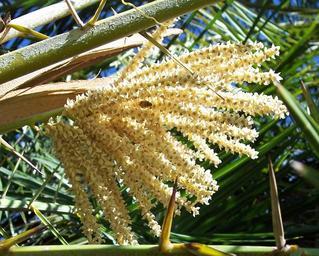 Keywords: Reclinatabloom.JPG Male inflorescence of Phoenix reclinata acanthophylls not true spines but modified leaflets in foreground pollinator present white scales on rachis above own see below Mmcknight4 Phoenix reclinata