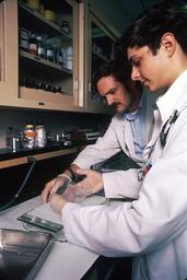 | Keywords: Recombinant DNA- southern blot.jpg Two male scientists with lab coats and rubber gloves are in a lab setting They are preparing for the southern blot technique used in recombinant DNA technology These new technologies have revolutionized the way scientists can look at the detail of cellular molecules Topics/Categories People -- Adult People -- Health Professional Science and Technology -- Genetics Type Color Photo Source National Cancer Institute Linda Bartlett Photographer 2015 1980 Reuse Restrictions None - This image is in the public domain and can be freely reused Please credit the source and/or author listed above Linda Bartlett Photographer PD-USGov-HHS-NIH Media from National Cancer Institute Visuals Online Images uploaded by Fæ Southern blot |