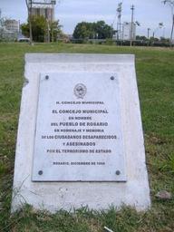 | Keywords: Recordatorio desaparecidos, Rosario.jpg A plaque in memory of desaparecidos victims of forced disappearance by the 1976-1983 military dictatorship in the Scalabrini Ortiz Park Rosario Argentina The plaque reads El Concejo Municipal en nombre del pueblo de Rosario en homenaje y memoria de los ciudadanos desaparecidos y asesinados por el terrorismo de Estado Rosario diciembre de 1999 In English The Municipal Council in the name of the people of Rosario in hommage and memory of citizens disappeared and murdered by State terrorism Rosario December 1999 I took this photo on October 2005 2006-03-31 own assumed Pablo-flores Rosario Argentina Plaques in Argentina Disappeared people October 2005 in Argentina |
