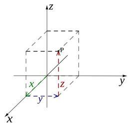 | Keywords: Rectangular coordinates.svg The location of a point P in three dimensional Cartesian coordinates Its position has been decomposed into three vectors aligned along <math>\hat x \hat y \hat z </math> Own 06-21-07 Cronholm144 cartesian coordinates space |