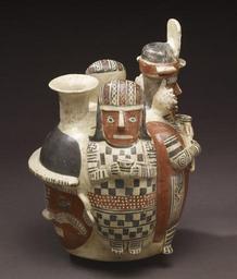 | Keywords: Recuay - Effigy Bottle - Walters 20092037 - Left Side.jpg Northern Peru's pottery traditions focus on three-dimensionality the vessels often modeled into a variety of volumetric forms depicting human figures fruits or vegetables and even architecture The coastal Moche and their highland Recuay neighbors were masters of the modeled form having explored and perfected this tradition whose origins reach back as much as a thousand years among cultures of the Early Horizon 900 -200 BCE Recuay pottery is typically thin-walled and made from a kaolin-based clay Vessels are decorated with negative-resist and positive slip painting as well as an unusual post-fire resist black organic pigment The varied resist-painting techniques allowed Recuay artists to create complex design fields on the positive slip-painted backgrounds Recuay art and especially its narrative pottery features the Andean concepts of dualism and reciprocity as key universal facets Emphasis was placed on dyads such as male-female which is aptly expressed by this extraordinary figural bottle A finely dressed noble woman stands at opposing sides of the four-sided vessel while a male personage flanks the other two faces The males pertain to a second dyad of warrior and captive the latter represented as a trophy head rather than a full figure The women and warrior cradle qero-like ceremonial cups in their hands; the male figure also clutches a war club in his right hand His fine clothing and headdress identify him as a member of the ruling class The iconic face in his headdress recalls depictions of ancestors and cult figures as prime shamanic beings that often adorn the heads of authority figures from earliest times throughout Peru Considered together this four-sided figural vessel embodies the Andean ideology of war and sacrifice to ensure the earth's fertility and maintain universal balance The taking of captives for ritual sacrifice was facilitated by the victor's shamanic power here implied by the male figure's headdress As elsewhere in ancient Peru this ceremonial pageant was a sacred necessity and the responsibility of the nobility It is reflected in stone sculptures from the Recuay area the highland Callejón de Huaylas region which feature small trophy heads and larger male figures carrying clubs shields or decapitated heads The Recuay tradition of public stone sculptures portraying women echoes their depictions on pottery vessels signaling the importance of female participants in both ritual and political events 200 BC-AD 500 Early Intermediate earthenware slip paint cm 28 26 20 57 accession number 2009 20 37 80192 Michael Robins date and mode of acquisition unknown John G Bourne date and mode of acquisition unknown Walters Art Museum Gift of John Bourne 2009 place of origin Northern Highlands Walters Art Museum license Pre-Columbian art in the Walters Art Museum Recuay pottery Media contributed by the Walters Art Museum needs category review |