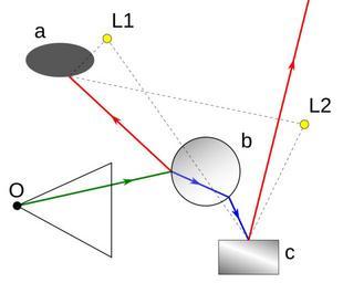 | Keywords: Recursive raytracing.svg Idea of recursive raytracing Idea of recursive raytracing The sample 3D scene has two lights and 3 objects a - oval nontransparent nonreflecting b - sphere transparent and reflecting c - cube nontransparent but reflecting Observer camera is placed at point O Primary ray green is emited from O and hits object b Since this object reflects and refracts light two secondary rays are emitted from hit point red for reflected and blue for refracted ray Reflected ray hits object a and none secondary rays are emitted Refracted ray hits object b and is refracted one more time reflected ray hasn't been show however it should be emitted too This ray hit object c and just one reflected ray is emitted It do not hit any object and recursion stops Thin dashed lines are shadow rays - additional rays use to determine visibility of light object b occlude light L1 when point on b is shading when point on a is shading object blocks light L1 Computer graphics Ray tracing Shading |