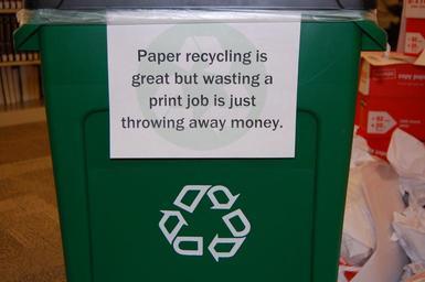 | Keywords: recycle display printing waste library university libraries “metropolitan state university” metrostate “saint paul” minnesota “dayton’s bluff” Part of a display exhibited on the first floor of the Metropolitan State University Library and Learning Center demonstrating the amount of unclaimed or discarded print material in the library over the course of one week. The sign on the recycling can says, "Paper recycling is great but wasting a print job is just throwing away money." This photo has been donated to the public domain. If you would like to provide an attribution, use the URL of this photo. Part of a display exhibited on the first floor of the Metropolitan State University Library and Learning Center demonstrating the amount of unclaimed or discarded print material in the library over the course of one week. The sign on the recycling can says, "Paper recycling is great but wasting a print job is just throwing away money." This photo has been donated to the public domain. If you would like to provide an attribution, use the URL of this photo. |