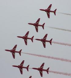 | Keywords: Red.arrows.formation2.arp.jpg Part of a Red Arrows formation at Kemble Airshow Kemble Gloucestershire England <br> Taken by Adrian Pingstone in June 2004 and released to the public domain <br> 2005-04-12 own assumed Arpingstone Red aircraft Smoke trails of aerobatic teams 2004 Kemble Air Show Aircraft formation flight of the Red Arrows BAE Hawk in the 2000s |