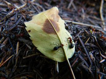 Keywords: red black ants leaf animals insect worker nature busy pine needles forest wood ants