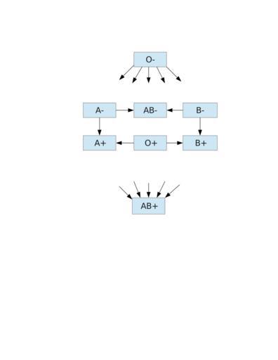 Keywords: Red blood cell donation chart.svg en A chart showing red blood cell compatibility The arrows point away from the donors and towards the recipients e g A- can donate to AB- AB+ A+ Note That an O- type person can donate to everyone and that an AB+ person can receive from everyone Also note that all blood types are compatible with themselves AB+ can donate to an AB+ 2013-07-21 11 20 24 own Softwatt cc-zero Uploaded with UploadWizard Blood types