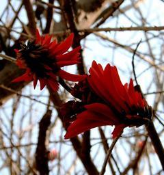 Keywords: red coral flowers rocket shaped neatly arranged sheathlike petals light twigs branches sky spring