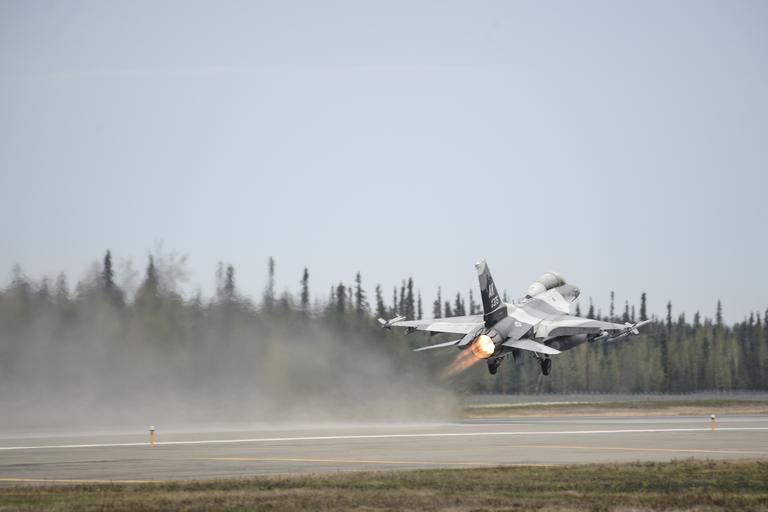 Keywords: F-16 Fighting Falcon assigned aircraft Aggressor Squadron takes off air force Red Flag Alaska combat