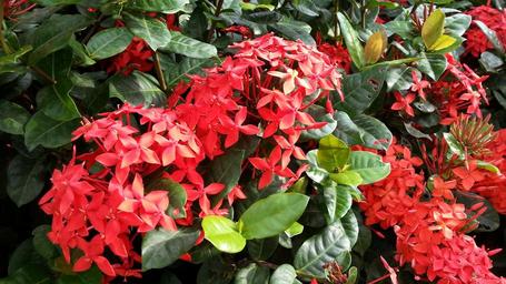 Keywords: red flowers flowering ixora cultivar green leaves petals flora plant flower red nature green botany plants flower garden foliage summer field bouquet summer flowers flower bud flower buds colors bloom wallpaper