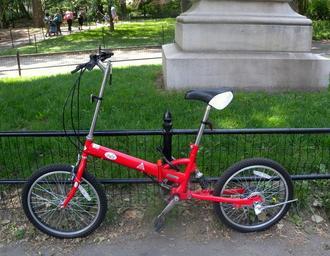 MAKE A MEME View Large Image Red iPed folder jeh.jpg en Red folding bike in Manhattan Upper West Side 2011-05-29 own Jim henderson cc-zero Uploaded with UploadWizard Folding bicycles