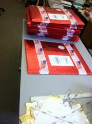 Keywords: Stack of 19x22" red envelopes being prepared. Stack of 19x22" red envelopes being prepared.