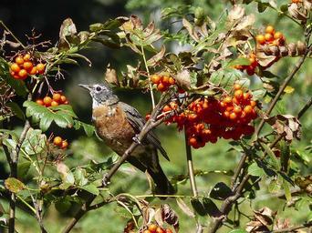 Keywords: red robin bird feathered animal wild life catching rowan berries tree nature turdus migratorius foliage migratory songbird