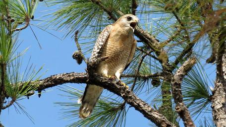 Keywords: red shouldered hawk perched branch wildlife bird nature raptor tree pine portrait