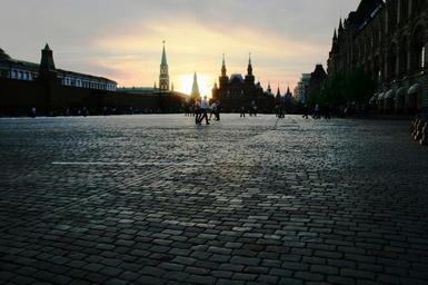 Keywords: red square paving vast flat plaza public place light reflection historic buildings outlined sunset glow evening sky