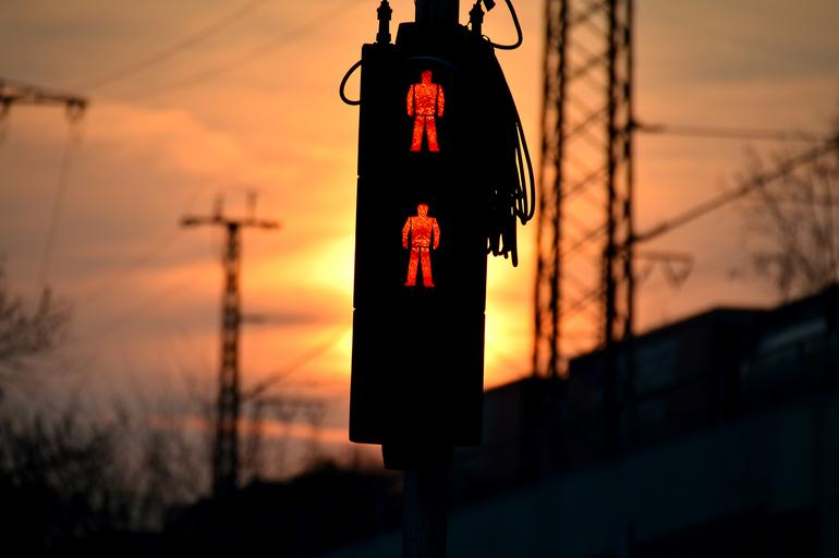 Keywords: red traffic lights sunset light signal footbridge red traffic lights