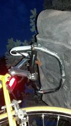| Keywords: marco-bicycle marcobicycle rebuild bike bicycles canvas yellow-bikes yellowbikes panniers bags canvas-bags canvasbags I added these longer bar-ends curved inward to act like a rack for the seat bag, or other things, if not using the bag. It works beautifully and now the rear bag can be opened and the contents easily accessed instead of fighting the downward pull of gravity and the full bag. The bar-ends can be tilted up or down to adjust the bag's height or angle. Works pretty good. It looks heavy, and IS heavier than a $59 dollar seat bag support, but this was free and not really that heavy. I added these longer bar-ends curved inward to act like a rack for the seat bag, or other things, if not using the bag. It works beautifully and now the rear bag can be opened and the contents easily accessed instead of fighting the downward pull of gravity and the full bag. The bar-ends can be tilted up or down to adjust the bag's height or angle. Works pretty good. It looks heavy, and IS heavier than a $59 dollar seat bag support, but this was free and not really that heavy. |