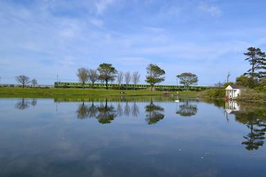 Keywords: reflection pond train green blue peaceful water calm peace sunny ireland view